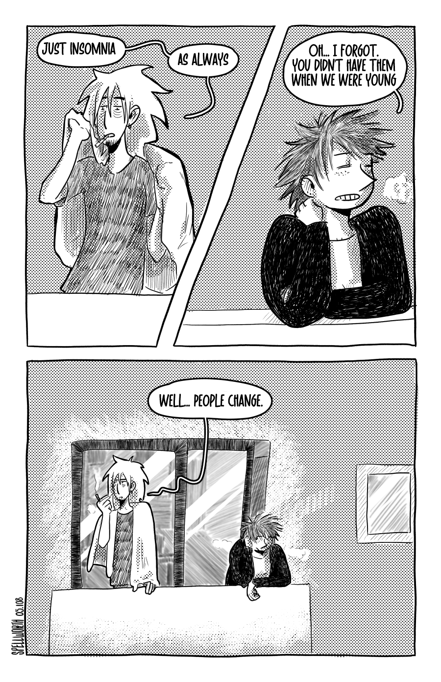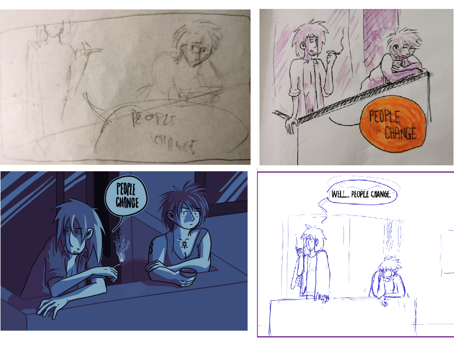 Here are the different iterations, from bad sketch to rendered to the comic draft.